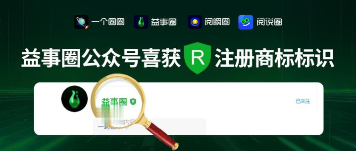 此次品牌升级同步完成商标认证,“益事圈”公众号已正式获得国家商标局注册商标标识(®),标志着品牌合法权益得到法律保障,为长远发展奠定坚实基础。